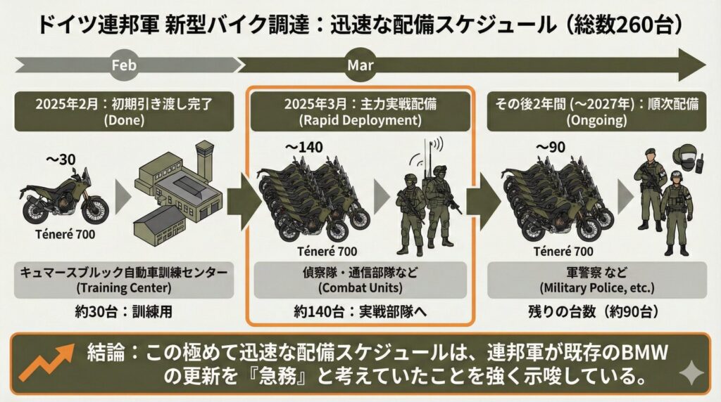 調達スケジュールに注目すると2025年2月に約30台をキュマースブルック自動車訓練センターへ引き渡し完了し、2025年3月には約140台を偵察隊や通信部隊など実践部隊へ配備。