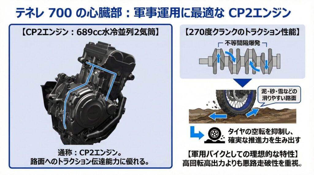 テネレ 700の心臓部である689cc水冷並列2気筒エンジン(通称CP2エンジン)は、軍事運用においても特筆すべき特性を持っています。