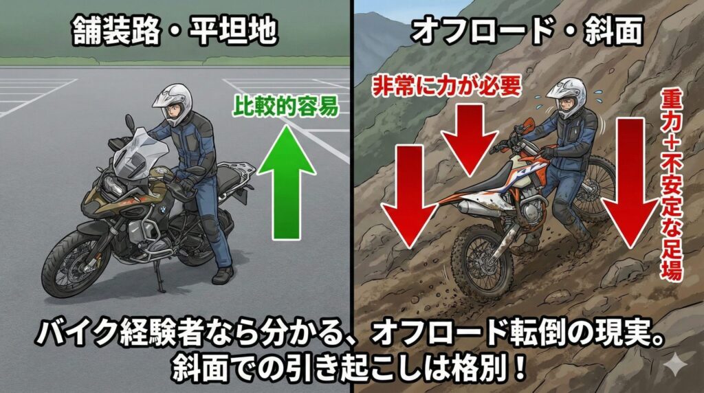 バイクでのオフロード走行の経験がある方は、特に理解していだだけるかと思いますが、舗装された道路上かつ平坦地でバイクを引き起こすのと違い、オフロードでは斜面で転倒する場合も多く、踏ん張りがきかず非常に力が必要になります。