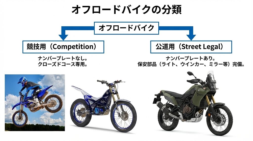 まずオフロードバイクを大きく分けると競技用と公道用バイクに別れます。