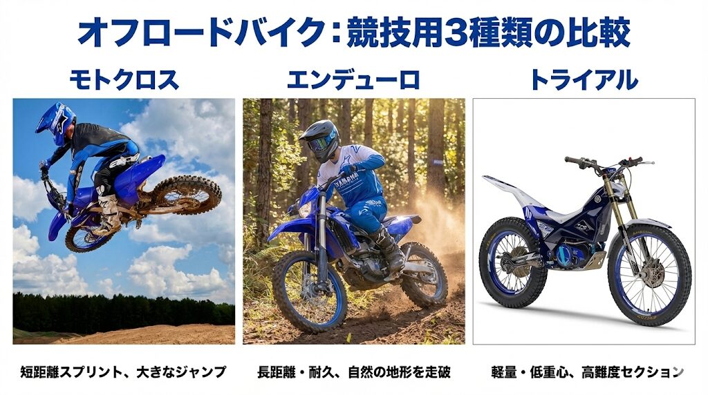 オフロードバイクの競技はモトクロス、エンデューロ、トライアルなどがあり、それぞれの競技に応じたバイクがあります。