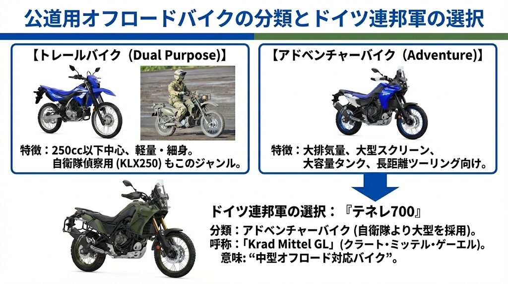 自衛隊が採用している偵察用オートバイのKLX250は軽量なトレールバイクのジャンルになり、ドイツ軍は自衛隊と比較すると大きいバイクを採用している点が特徴です。