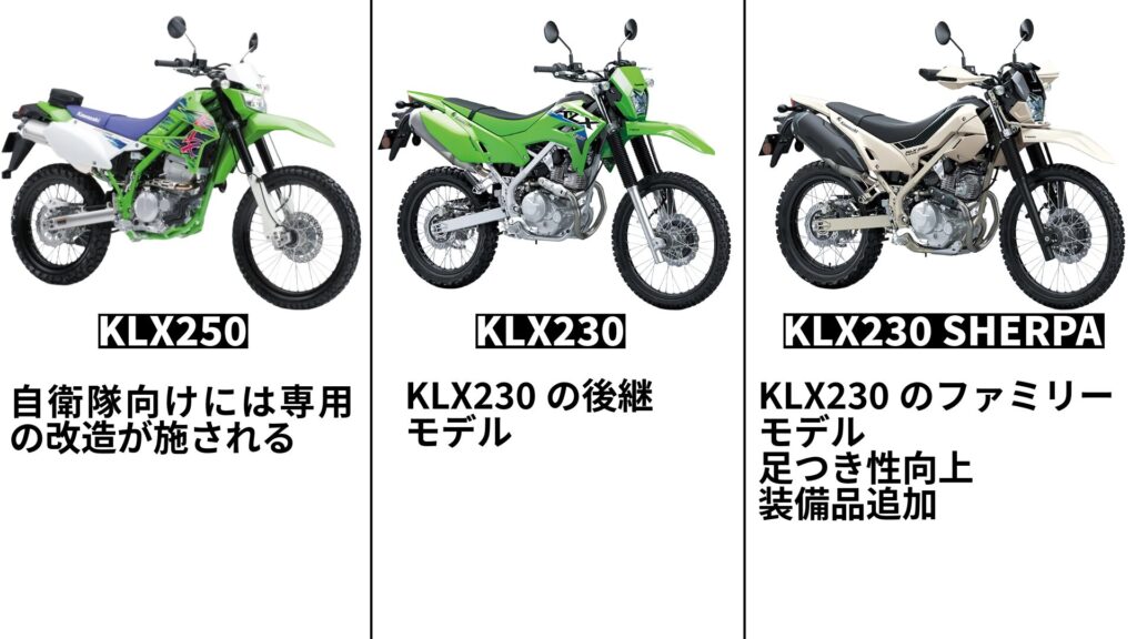 この比較から見えてくるのは、KLX230 SHERPAがKLX250の単純な置き換えではなく、より乗りやすさを重視した方向の車両だということです。