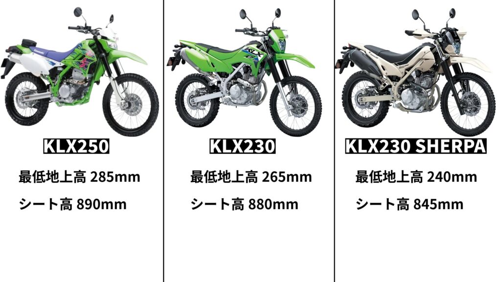 - KLX230 SHERPA:最低地上高240mm / シート高845mm