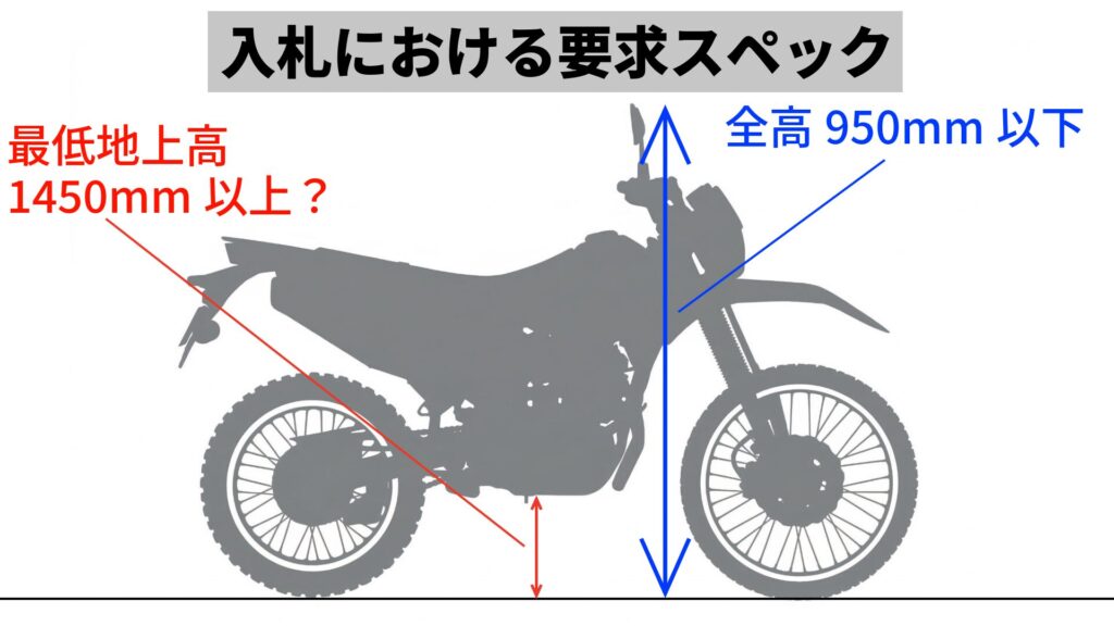 要求性能の規格を見る限り、全体としては一般的な250ccクラスのオフロードバイクに近い内容です。