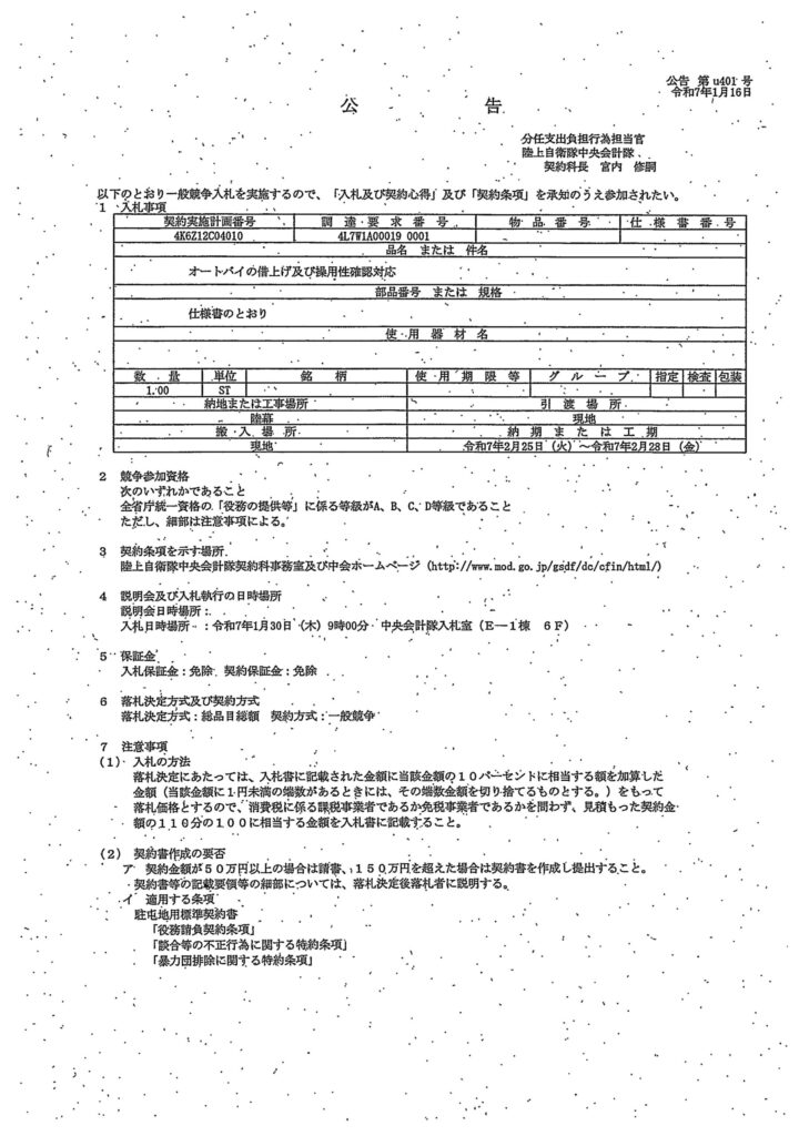 陸上自衛隊は一般競争入札において、**「オートバイの借上げ及び操用性確認対応」**という公告を出しました。