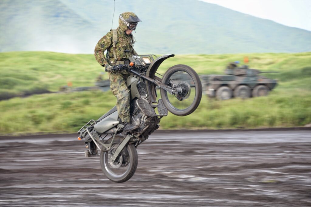 偵察部隊では、駐屯地記念行事などでバイクドリルを披露し、ジャンプ、ウイリー、アクセルターンなど、高い練度を見せることがあります。そうした部隊には、二輪操縦レベルの高い隊員も多いはずです。