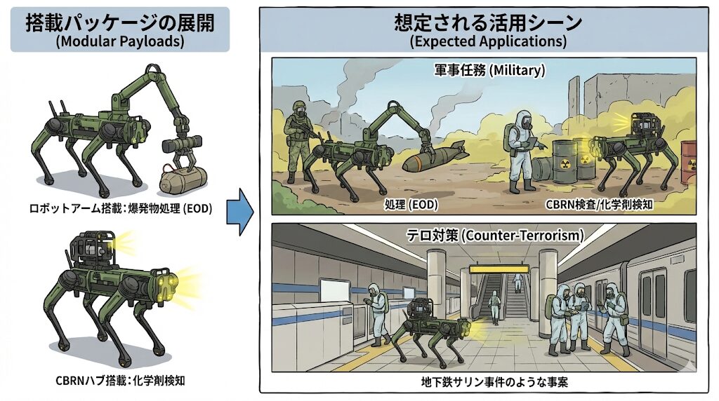 軍事においてはEODと呼ばれる爆発物処理や、化学物質の検知、除染などへの対応が想定されています。