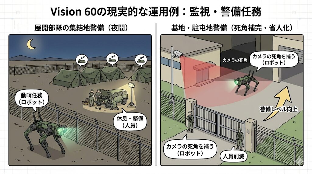 基地や駐屯地警備において、カメラやセンサーの死角を補い、動哨任務につかせて警備レベルを上げる、警備に必要な人員削減といった使い方になるのではないかと思います。