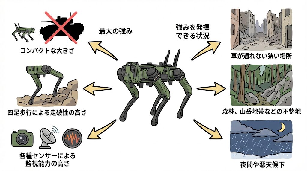 現実的にはこういった環境での監視や警備任務に向いているのではないかと思います。