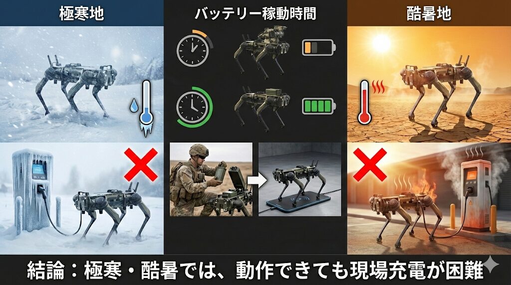 極寒地や酷暑地では、動作はできても現場での再充電が困難な場合があります。