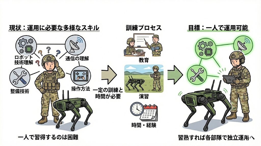 となると各部隊で独立的に運用するにはロボット技術や通信の理解、整備技術、操作方法など、隊員ひとりが運用できるようになるまでには、一定の訓練や、時間が必要になるのではないかと思います。