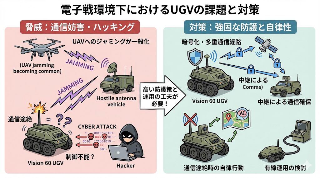 現代のカウンターUAV、対無人航空機戦術ではドローンへのジャミングなどが一般的となりつつあり、UGVにおいても通信妨害やハッキングなど、通信手段に対しての高い防護策や運用手段の工夫が必要になってきます。