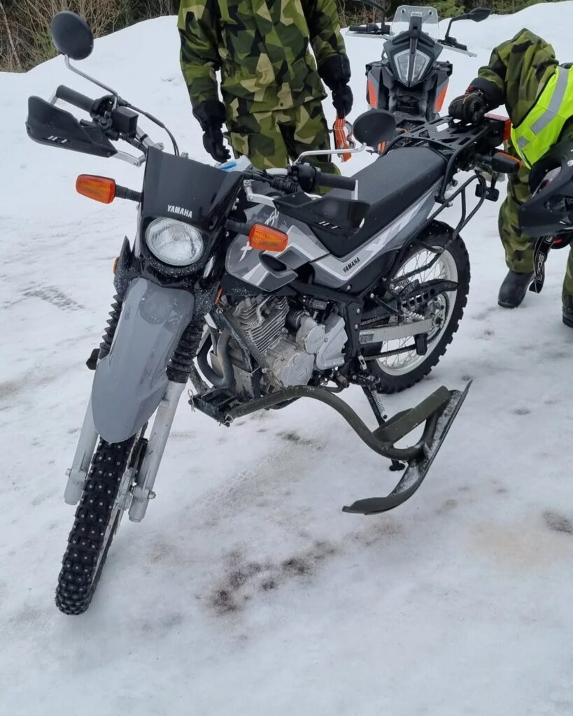 これは世界でもスウェーデン独自の装備で、1960年代のハスクバーナMC 256Aから受け継がれてきた伝統です。バイクにスキーを装着して雪原を走るという発想自体、北欧ならではの割り切った運用思想といえます。