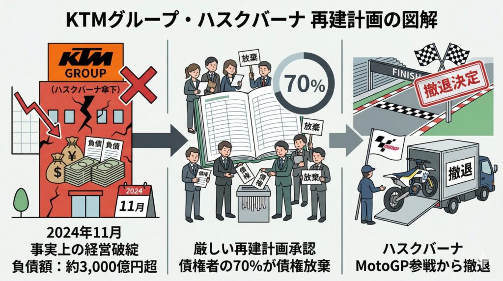 ハスクバーナは元々スウェーデンの企業でしたが、カジバ、BMW、そしてKTMへと転売を繰り返し、現在はオーストリアのKTMグループ傘下にあります。2024年にはKTMの財務問題が表面化しました。